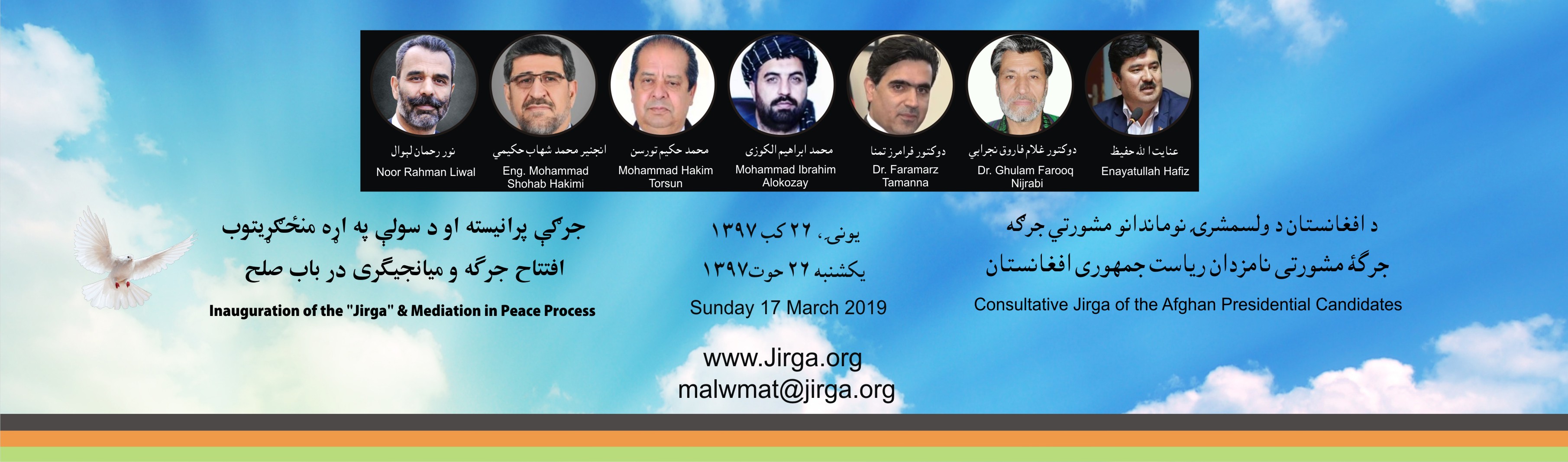 We, Enayatullah Hafiz, Dr. Ghulam Farooq Njrabi, Dr. Faramarz Tamanna, Mohammad Ibrahim Alokozai, Mohammad Hakim Torsun, Eng. Mohammad Shohab Hakimi and Noor Rahman Liwal, Afghanistan 2019 Presidential Election candidates, with the help of Almighty Allah and hoping for a peaceful, prosperous and independent Afghanistan with free, informed and prosperous citizens, have come together and established the “Consultative Jirga of the Afghan Presidential Candidates” hereinafter called Jirga.